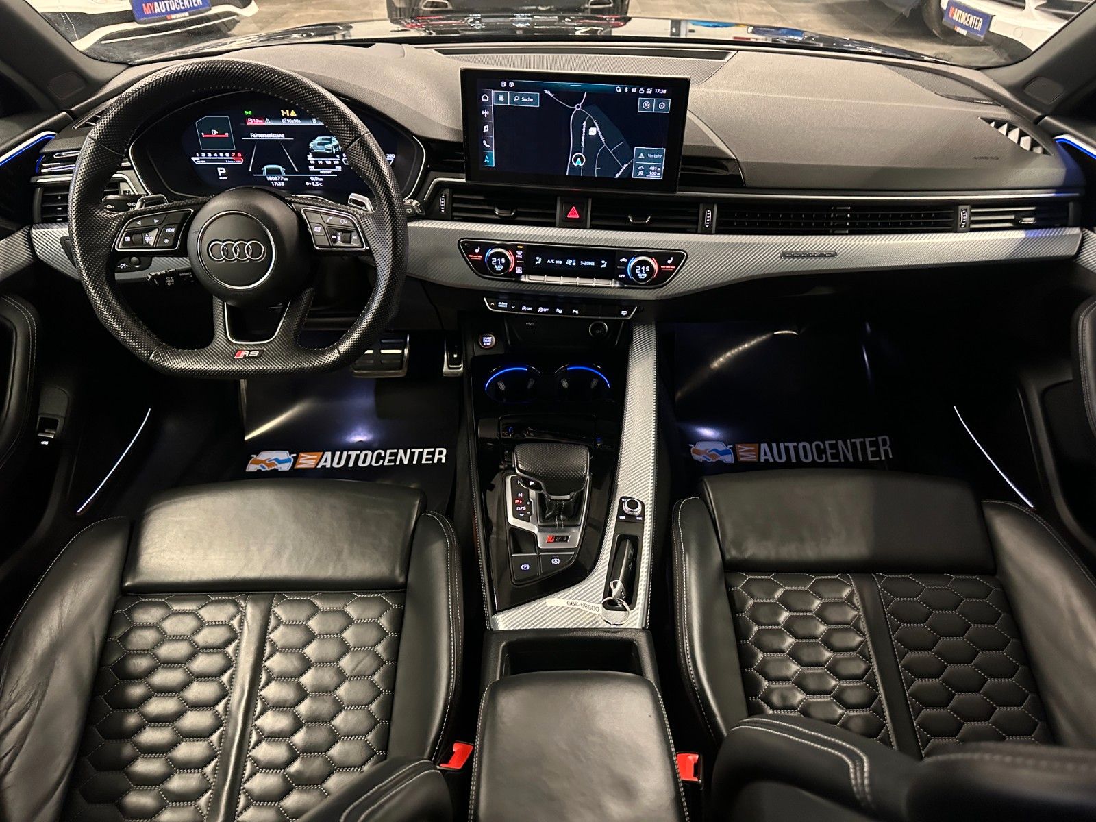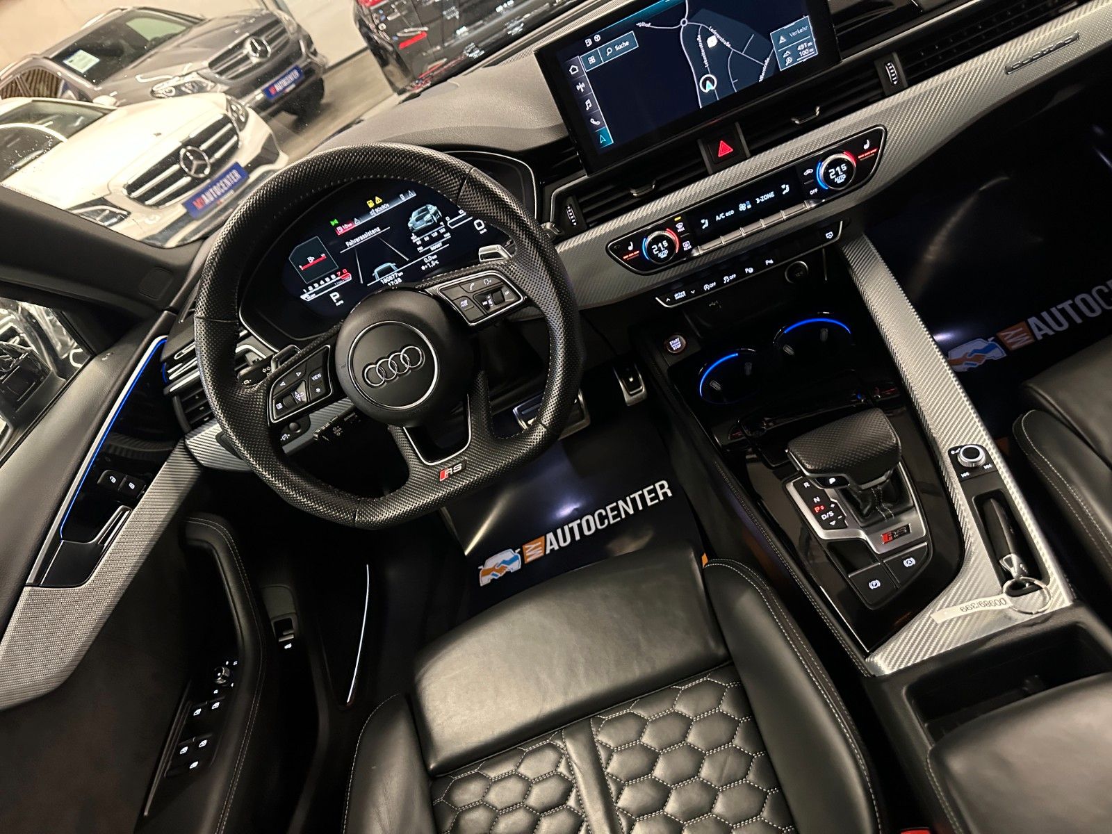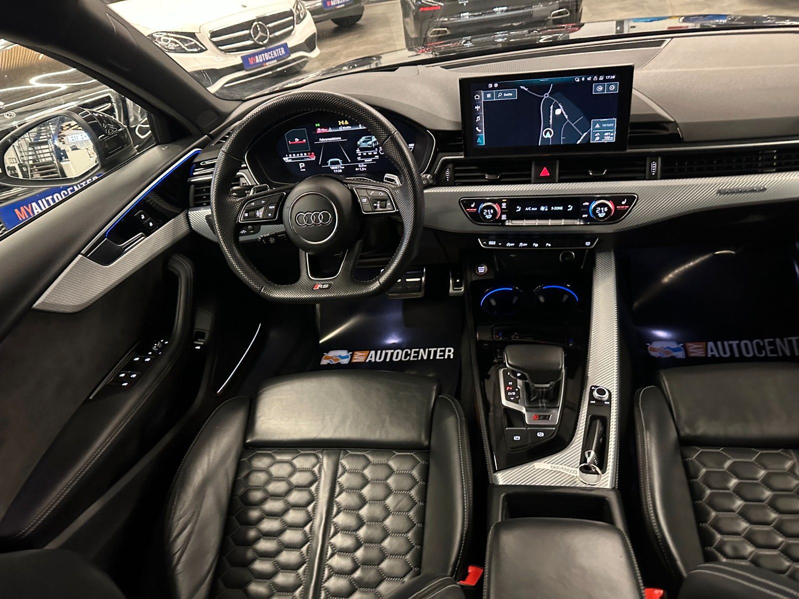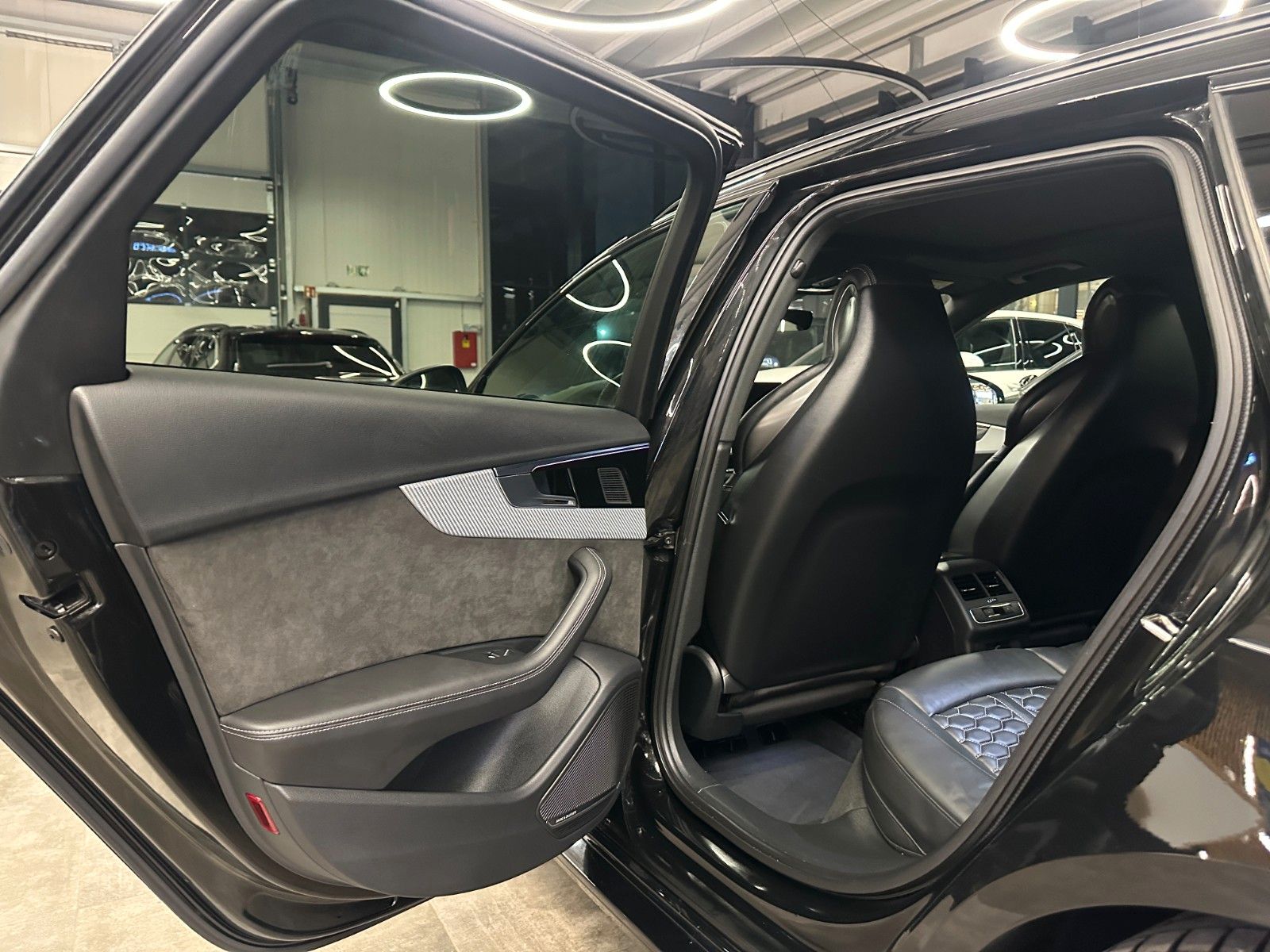 Assistenz-Paket Stadt mit Assistenz-Paket Parken, Assistenz-Paket Tour, Audi connect (Internetbasierende Dienste), Audi Ringe und Schriftzüge schwarz glänzend, Außenspiegel elektr. verstell-, heiz- und anklappbar, mit Abblendautomatik und Bordsteinautomatik, Bluetooth-Freisprecheinrichtung mit Spracherkennung (Audi Phone Box), Dynamik-Paket, Fahrassistenz-System: Anfahr-Assistent (hold assist), Head-up-Display, Innenspiegel mit Abblendautomatik, Kombiinstrument digital (virtual cockpit plus), Komfort-Klimaautomatik 3-Zonen, Kontur / Ambientebeleuchtungs-Paket (plus), LM-Felgen 9x20 (5-Segmentspeichen, Evo-Design, Schwarz, glänzend), LM-Felgen 9x20 (5-Segmentspeichen, Evo-Design, Schwarz, glänzend, für Winterbereifung), Metallic-Lackierung, Multi-Media-Interface MMI Navigation Plus mit MMI Touch, Optik-Paket schwarz plus, Panoramadach vorn elektrisch, hinten fest, RS-Sportabgasanlage, Sitzbezug / Polsterung: Leder Feinnappa, Wabensteppung mit Logo-Prägung in Vordersitzlehnen, Sound-System Bang & Olufsen, Verglasung hinten abgedunkelt (Privacyverglasung) und Türscheiben vorn Akustikglas