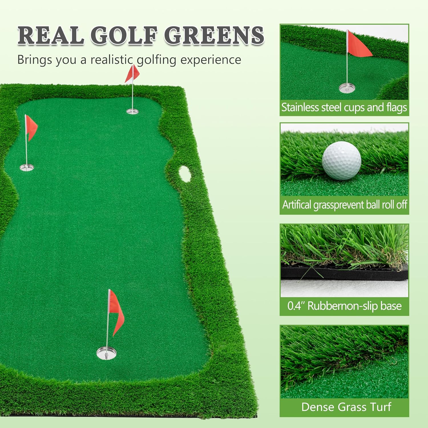 This indoor/outdoor artificial grass putting green is the perfect addition to any home or office for golf enthusiasts. Designed to mimic real golf course conditions, it features premium PP turf that provides a realistic putting experience. The putting green comes with multiple cups and flags, allowing you to practice from different distances and angles. The included slope pads and movable golf cup enable you to adjust the difficulty and simulate various putting scenarios. Easy to carry and store, this putting green can be rolled up and taken anywhere, making it ideal for both residential use and travel. Whether you're a professional golfer or just starting out, this practice mat will help improve your putting skills and enhance your love for the game.