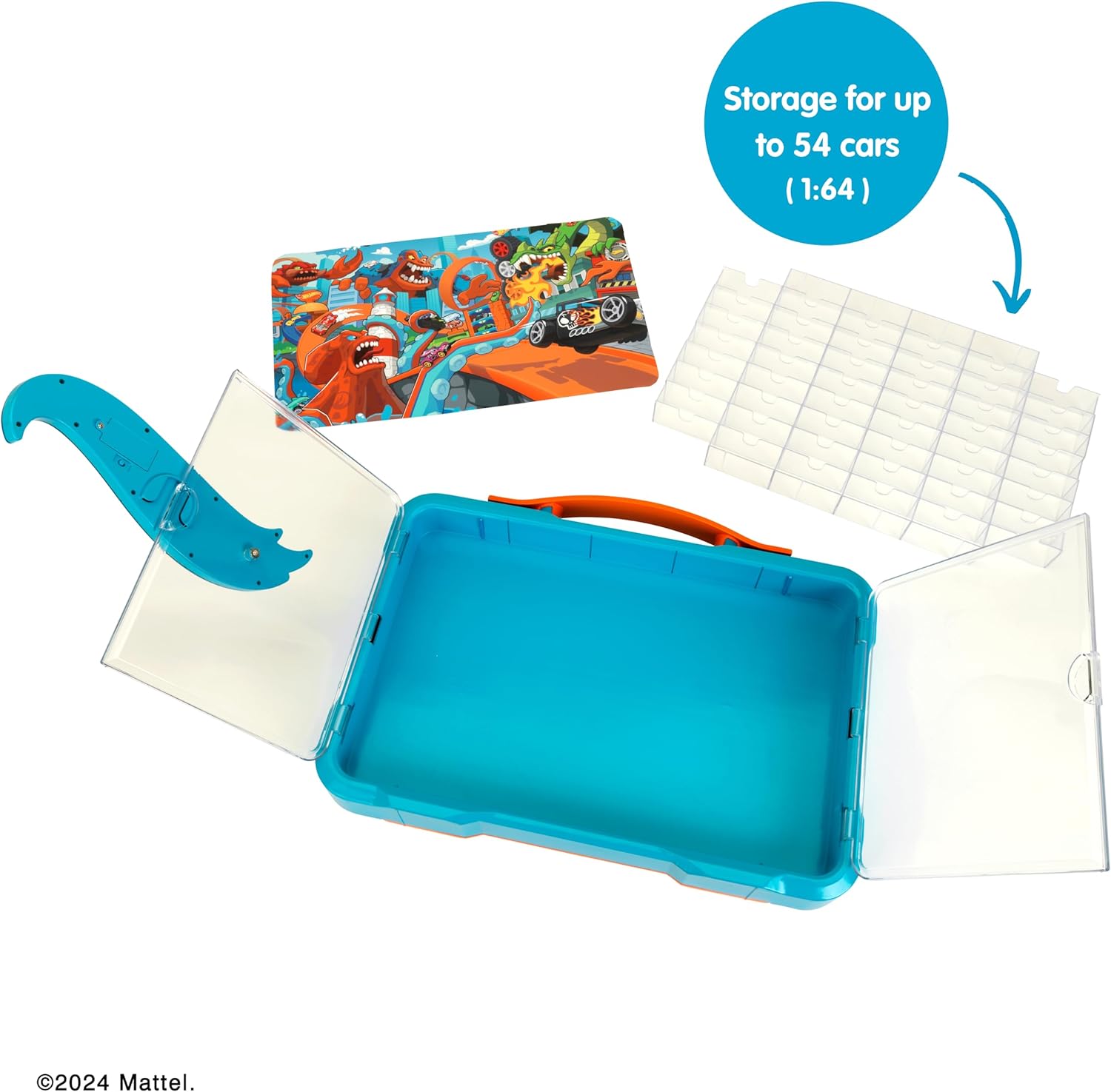 The dream of all Hot Wheels fans: a smart garage with a transparent hinged door from which the logo of these cool cars shines out. The owner of this elegant Hot Wheels garage can drive up to it easily, glide through the door, head to one of the 54 parking spaces, park smoothly and then rest easy in the knowledge that there is no better place for their beloved car. Closing the doors will simply make car lovers of all ages happy. That pleasure can be enjoyed quietly at home, as the case can easily be mounted on the wall as a showcase, or out and about at any time. Simply grab the display case by the practical handle and all the cars can be transported easily wherever you go. Hot Wheels collector's display case This sturdy display case contains storage compartments for up to 54 cars on a scale of 1:64 (vehicles not included). The display case with a cool poster at the back and a bright Hot Wheels logo on the front can be attached to the wall with standard screws and plugs (not included) or carried around wherever you go thanks to the handy carrying handles. - Dimensions: 58 cm x 9.4 cm x 43 cm - Suitable for children aged 3 and over - Batteries required: 2 x R03-AAA - not included